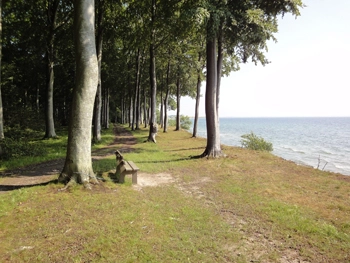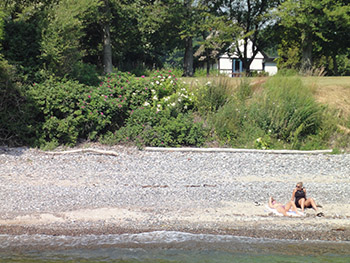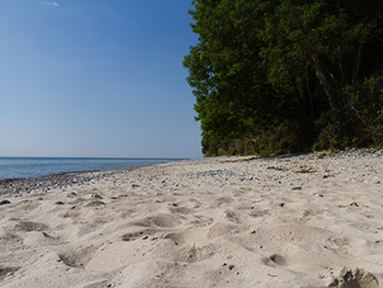 Haven som tilhører Strandhuset, afgrænses naturligt af beplantning omkring huset. Lejerene har adgang direkte til stranden af selvstændig sti langs skoven.