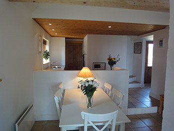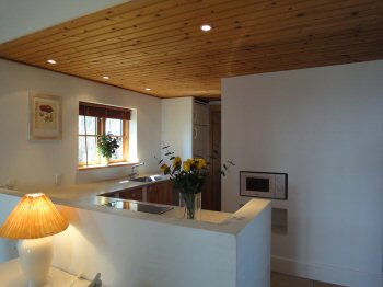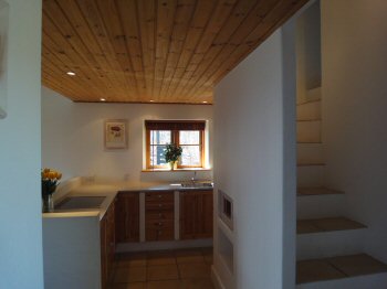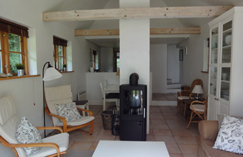 Funktionelt og landligt indrettet køkken med klinkegulv og hyggelige trælofter med indbygget belysning. En halvmur adskiller stue og køkken og skaber derved en naturlig forbindelse mellem de to rum. Fra køkkenvinduet er der udsigt direkte til skoven.