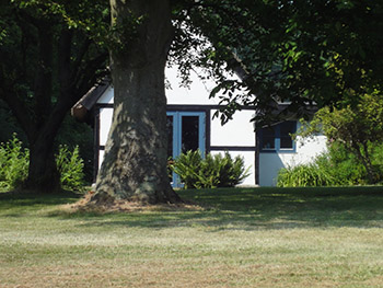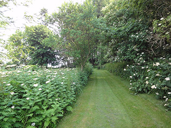 Den tilhørende have omgiver hele huset, og er indrettet med græsplæne direkte op til skov (foto) og kornmarker.