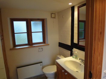 Moderne bad i rustik stil med fritlagt gammel bindingsværksmur. Indrettet med bruseniche, toilet, skabsmøbel med håndvask, stort indbygget skab, og stort spejl. Klinkegulv med gulvvarme.