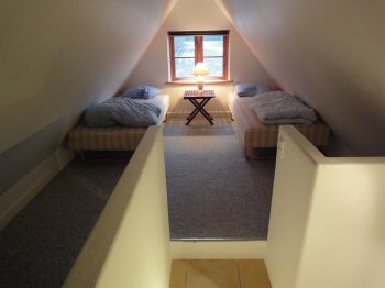 Hyggelig sovehems på første sal med adgang via trappe fra entréen. En flot udsigt over marker til skov fra vinduet. Indrettet med gulvtæppe og to komfortable enkeltsenge, der kan stilles sammen til en dobbeltseng. Mulighed for ekstra gæsteseng.